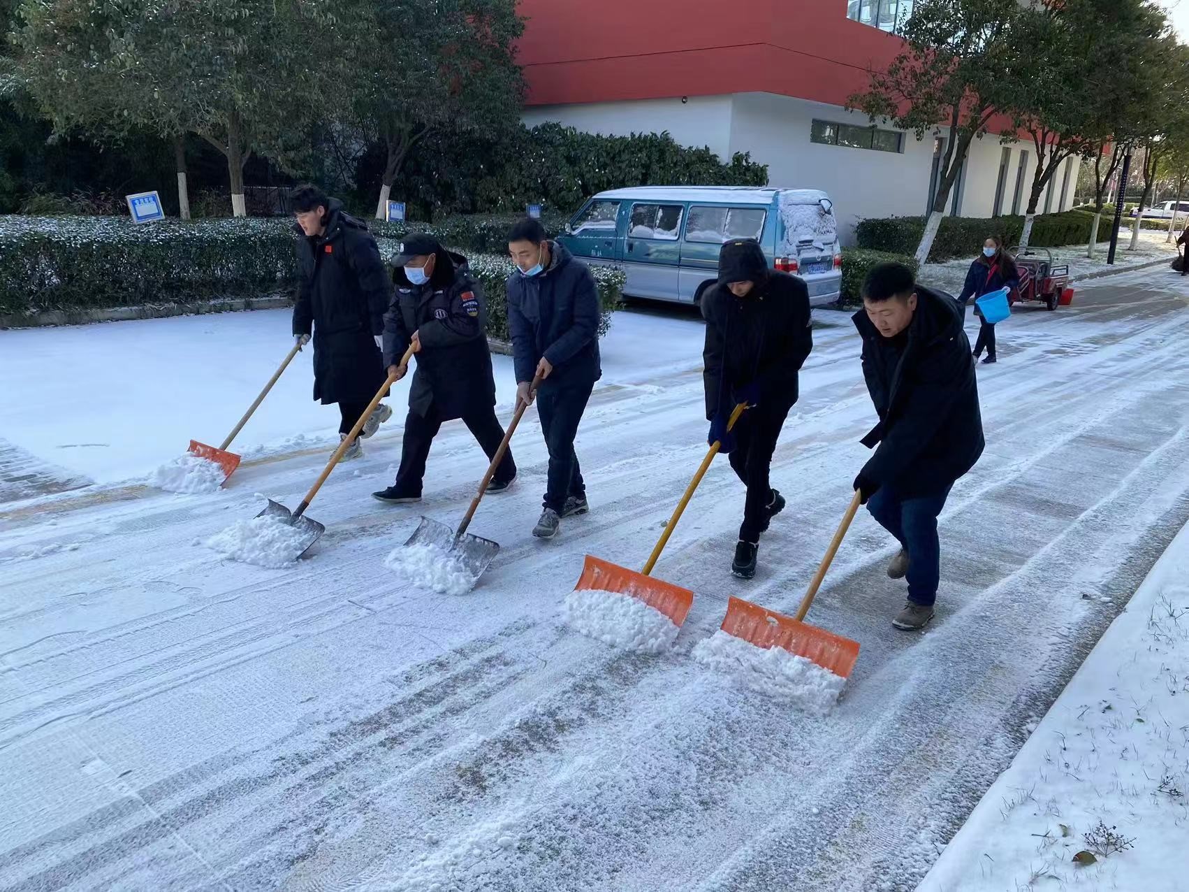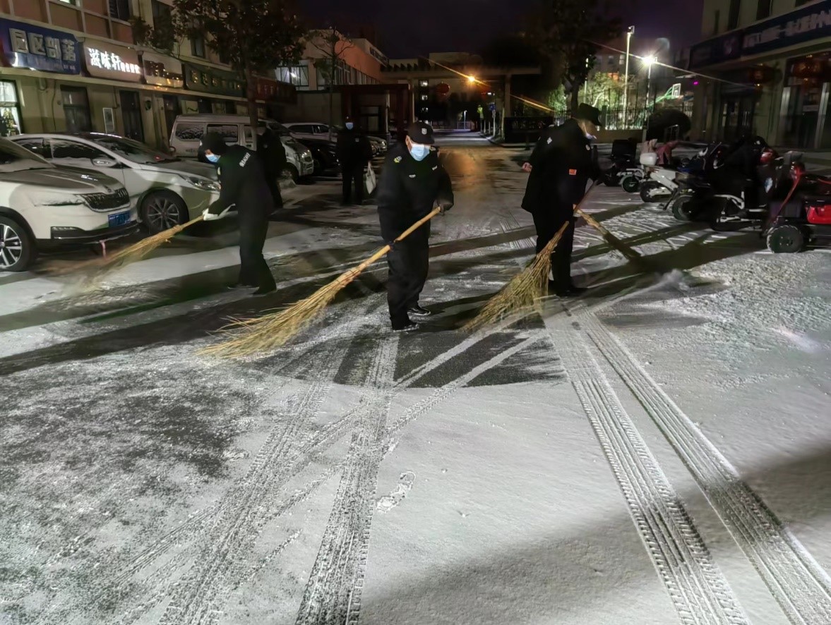 由于夜間雪情,道路積雪結(jié)冰,14日夜間,公司啟動應急預案,調(diào)集現(xiàn)場人員,利用掃把、鐵鍬針對各道口、坡道及主要行人路段開展作業(yè),確保各項目道路通行順暢。