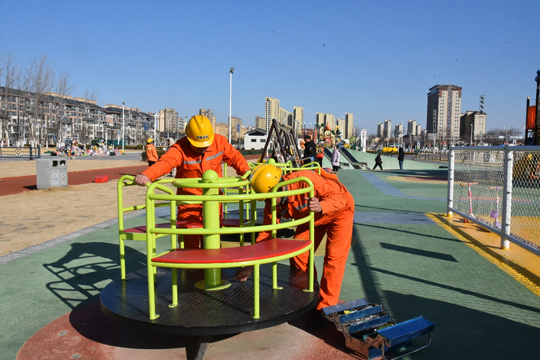 在公園廣場(chǎng)里,秩序井然,工作人員一絲不茍地對(duì)游樂健身設(shè)施進(jìn)行全方位檢查,“不遺漏”任何一顆螺絲、一根繩子,確保設(shè)施安全運(yùn)行,讓市民游客過(guò)一個(gè)“放心年”。