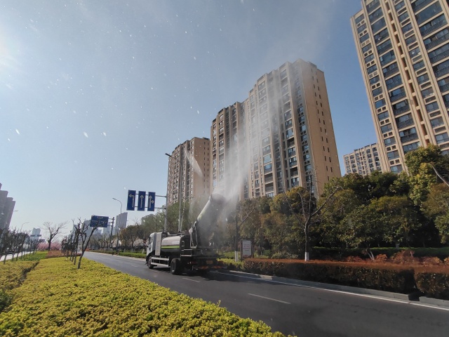 “空中”清洗,“洗”出清新氣。隨著春季氣溫的升高,兩臺(tái)搭載大型“霧炮”的多功能抑塵車每天“不辭辛勞”地在園區(qū)主次干道上緩緩行駛,噴射出的水霧在陽光照射下劃出一道道絢麗的彩虹,不僅裝扮了城市之美,更能有效“捕捉”空氣中PM2.5、PM10等懸浮顆粒,使空氣更加清新。